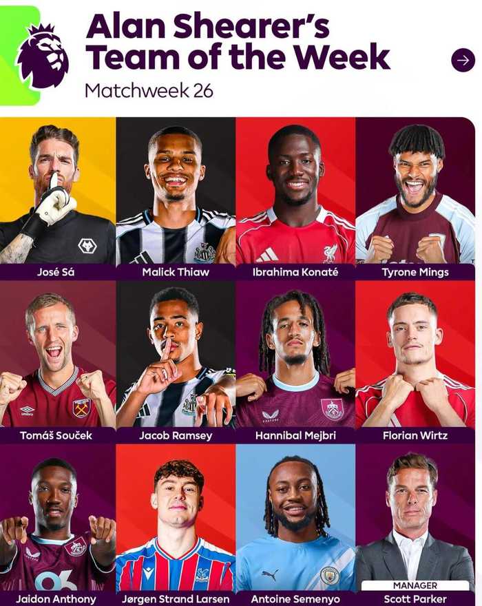 英超官方公布阿兰-希勒评选的本轮英超最佳阵容,具体如下: